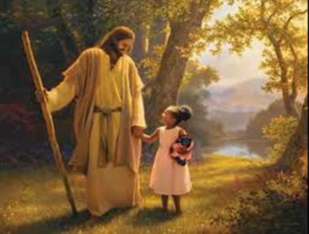 To me this picture shows the true meaning of childlike faith. Jesus, the Good Shepherd with His staff, lovingly looking down at His child (you and me) and holding their hand as they walk along in this world. His child looks into His eyes with a smile as they feel His love and the peace it brings.